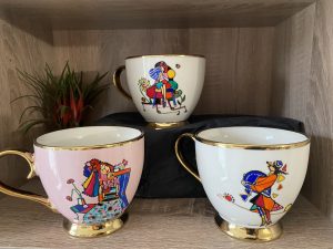 Mugs, assiettes, coupelles : peintures spéciales céramique lavables à la main de préférence.